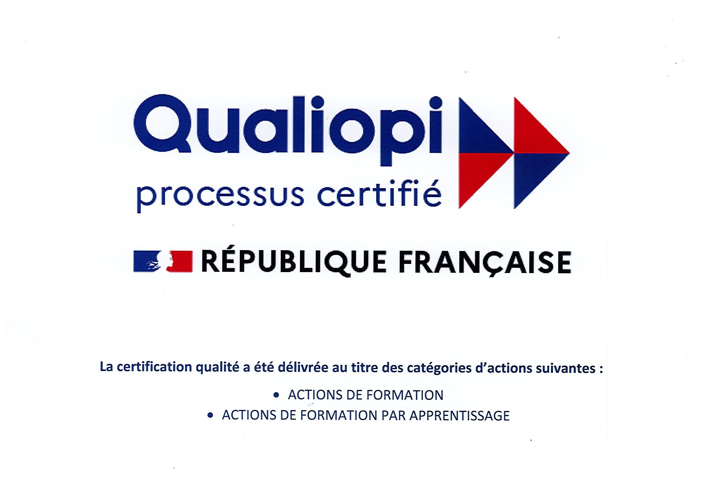 La certification qualité a été délivrée le 20/12/2020 et renouvelée jusqu’au 20/12/2027 au titre des catégories d’actions de formation suivantes: