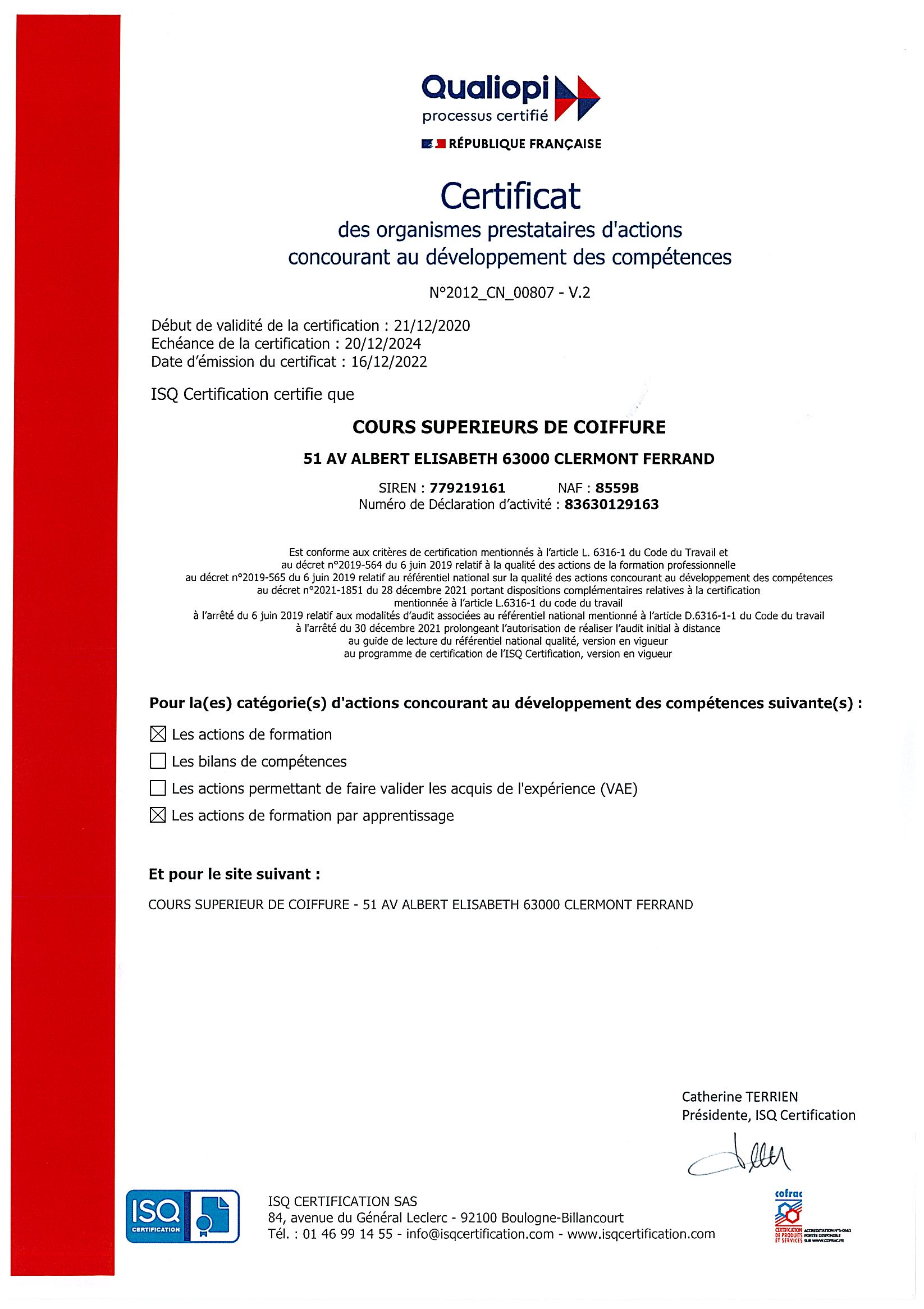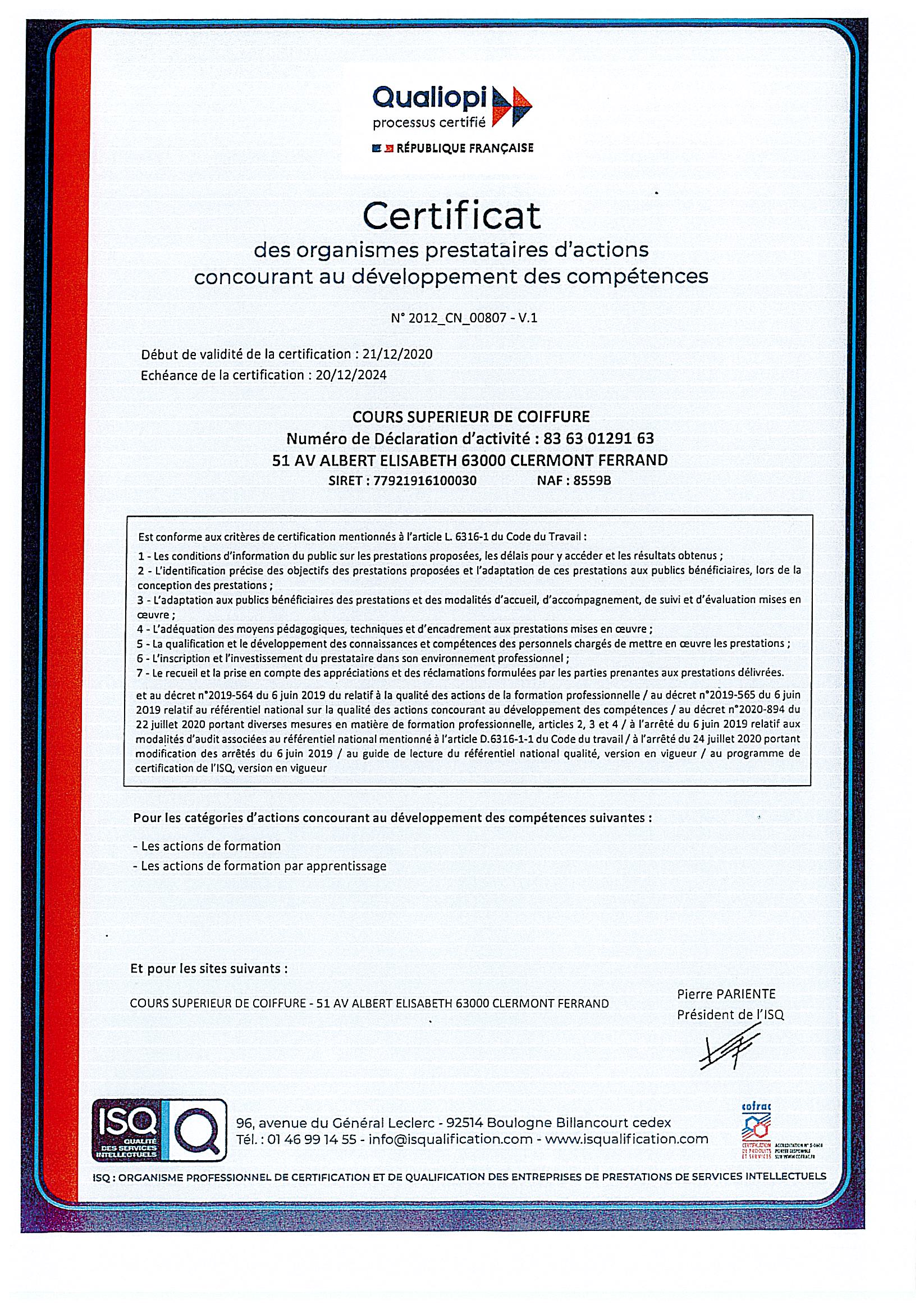Notre organisme de formation est reconnu depuis 2014 par l’OPQF et est inscrit au DATADOCK. Depuis le 21/12/2020, l’ISQ nous a attribué la CERTIFICATION QUALIOPI qui atteste de la qualité des prestations dispensées par notre organisme. Ces certificats de qualification professionnelle des organismes de formation permettent aux COURS SUPERIEURS DE COIFFURE d’être reconnus par des financeurs tels que Pôle Emploi et les OPCO.